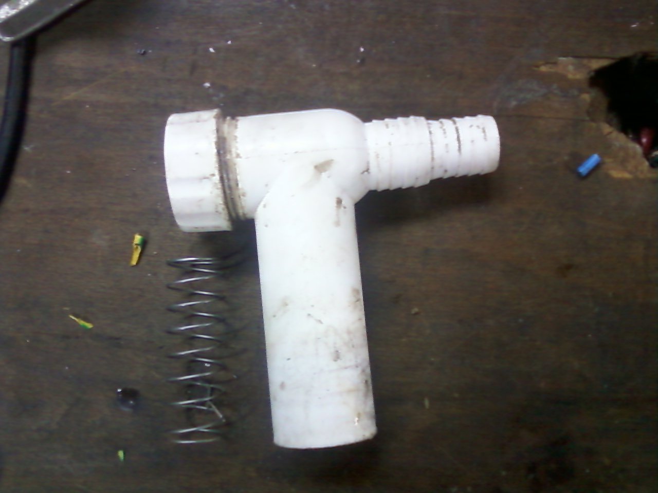 Ta opruga je jaka i pravi veliki otpor . Izvadi tu oprugu i ako ima i loptica u njemu , neka bude prazan priključak . Imao sam slučaj i da se tu nakupi prljavština oko te opruge pa se napravi čep.To je stavljeno u priključak da smrad iz kanalizacije ne prolazi u mašinu. U pumpi i crevu uvek ostane vode koja sprečava da smrad prođe tako da slobodno povadio to iz priključka.
