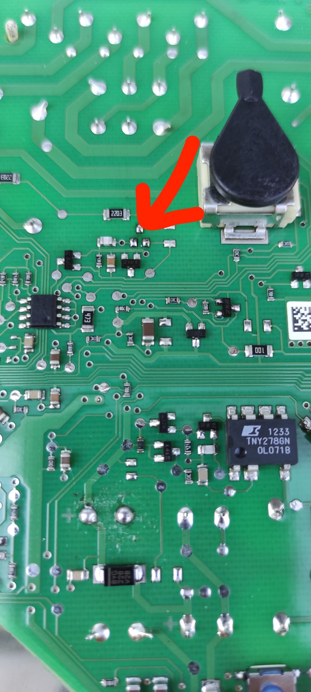 Istu komponentu imaš između glavnog prekidača i stabilizatora 5V na samoj ivici štampane ploče tamo gdje završava polukrug