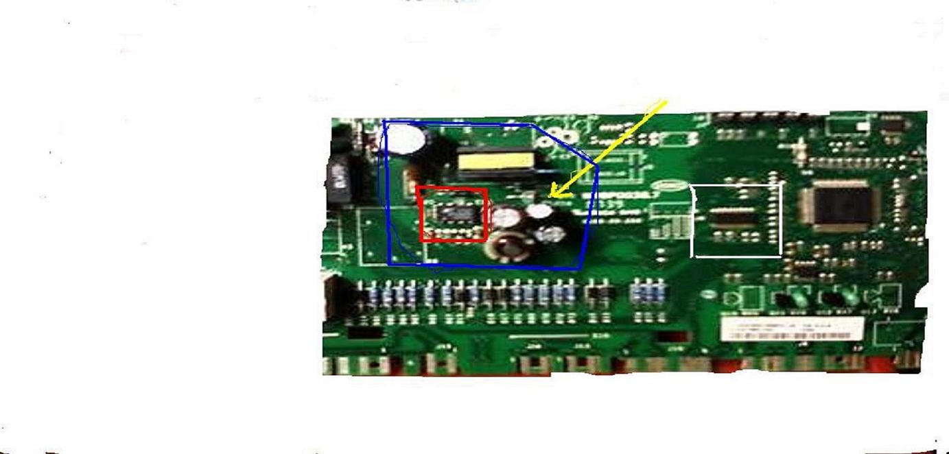 Juce sam radio na kartici, na ispravljackom delu ( uokvireno plavom bojom ) zamenio sam TNY 264 obelezeno crvenom bojom na diodu zuta strelica zalemio sam jos jednu diodu da bi napravio kapiju, na izlazu iz ispravljaca dobio sam pulsirajuci napon od 3 do 5 v . masina nije pokazivala nikakav znak za rad. Onda sam prikljucio laboratorijski trafo na diodu koju sam postavio i na minus kraj od elektrolita, pobudio sam procesor i masina je pocela da prima vodu, ali motor nije krenuo sa radom. Kada sam iskljucio laboratorijski trafo masina je i dalje mogla da se startuje, cim sam joj prekinuo dovod od 220 i ponovo ukljucio masina se nije mogla pokrenuti. Ponovio sam postupak sa lab. trafo i masina je proradila ponovo, primetio sam da se greje ULN 2003 ( ne moze prtom da se drzi ) obelezeno belom bojom.