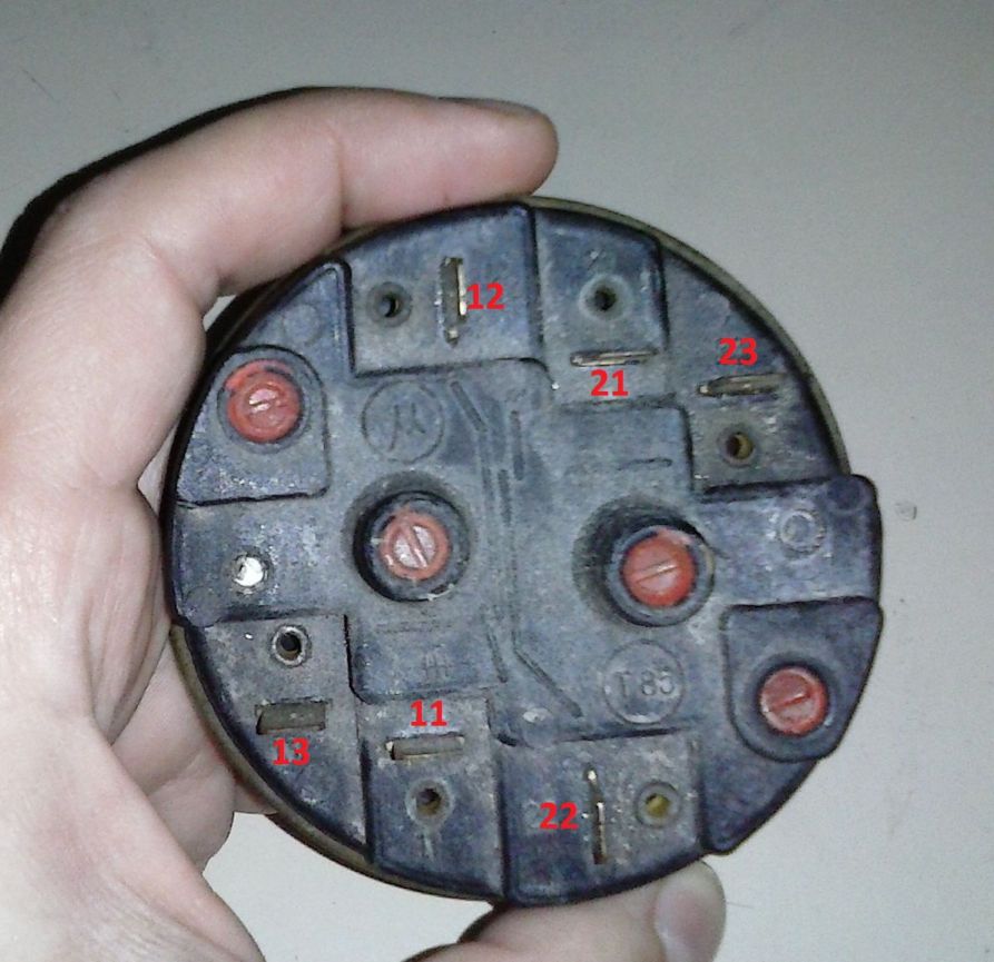 Na prvi "klik" se zatvara kontakt 11-13, a na drugi 21-23. Na prvi "klik" se otvara kotakt 11-12, a na drugi 21-22