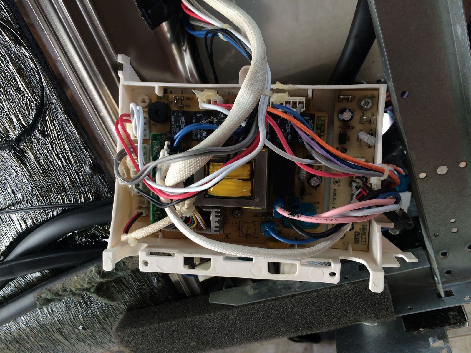 Ljudi hvala vam za savete i seme delova. U medjuvremenu su moji odneli masinu kod nekog lokalnog majstora(ne pitajući me ništa), i tamo je već par dana. Pošto ja radim u Bg, a mašina je u Valjevu, nisu mogli baš da čekaju toliko dok dođem i nastavim sa ispitivanjem (dolazim u Valjevo samo vikendom). U svakom slučaju evo slika mašine odozdo i elektronike, iako se baš ne vidi najbolje (slikao pre 15 dana).