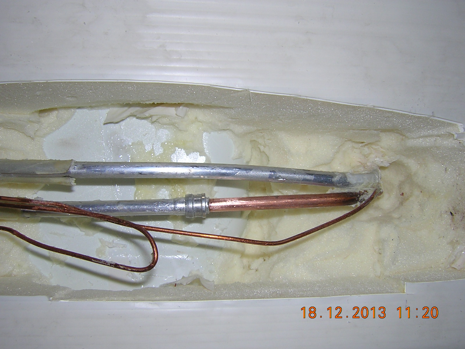 Pojavila se nova stvar kod ovog frizidera.Nije gas curio na spoju kako sam sumnjao nego je aluminijumska cev koj vodi od gornjeg isparivaca prema donjem gde se spaja sa bakarnom bila porozna i mislim da je do probijanja na cevi doslo uglavnom duz linije gde je kapilarna bakarna cev bila pripojena u termoskupljajucem plasticnom srevu.To se vidi po tragu od kapilare i rupicama uzduz tog traga. Mislim da su bar na ovom mom Indesitu ugradjene veoma lose alu cevi na kojima sam video poroznost i na unutrasnjoj strani.Zamenio sam ovu cev sa bakarnom i ugradio novi isparivac unutra.Sada se samo bojim da ne pusta i na alu cevima koji vode do dojneg isparivaca i od njega do kompresora.Ako se i tamo pojavi bice jos dosta posla.Pretpostavljam da je zamrzivacki isparivac od celicne hromirane cevi pa cu moci ako treba da spojim sa bakarnim samo sto ce posao biti veci nego ovo dosada. U prilogu stavljam slike alu cevi gde se vidi poroznost na njoj i mislim da je sramota za Indesit sto ovako los materijal ugradjuje ili je to mozda radjeno za "nasa istocna trzista"
