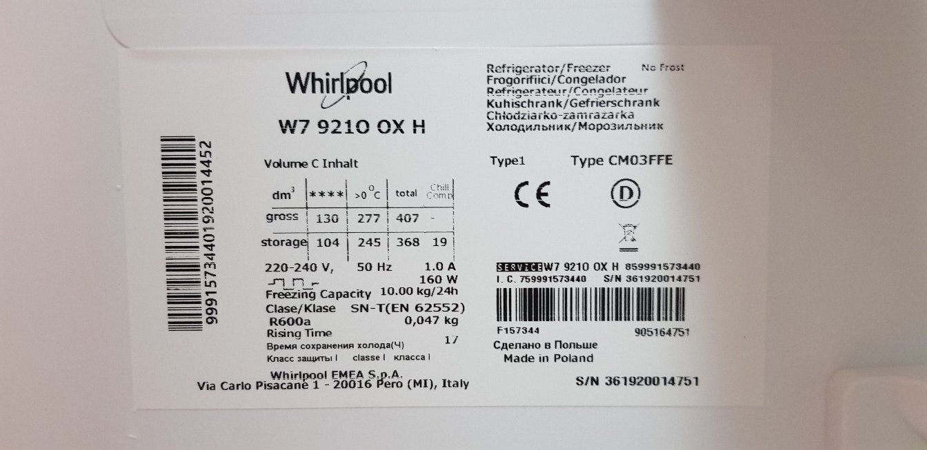 U pitanju je frižider Whirlpool W79210OXH serial no: 361920014751 type: CM03ffE