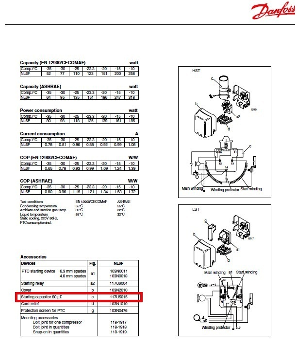Meni je taj kondenz bio sumnjiv od samog pocetka svaki danfossov katalog u semi veze ovog kompresora ima samo ptc ili startni rele i kondezator 80uF.(i ako bi isao bio bi na red sa PTC-om)