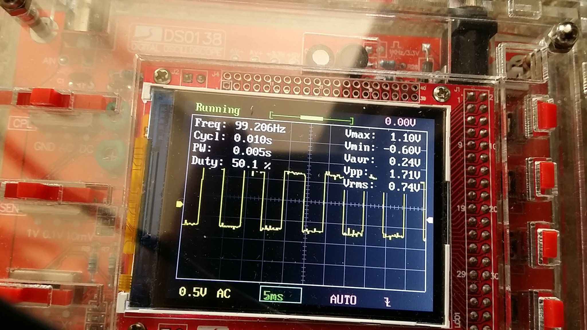 Digitalni multimetar interpretira AC i DC signal kao ekvivalentnu snagu grijanja na poznatom otporniku. Ne možeš sa njim mjeriti napon kao na osciloskopu! Probaj na njemu mjeriti ako ima duty cycle (omjer %) izmjeriti dali imaš promjene u omjeru sa davaća signala!