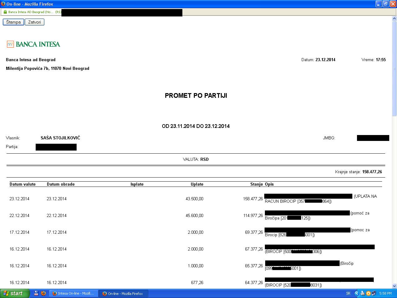 Novac je danas uplacen na Birocipov racun koji mi je dao da ima u banci Intesa. Javio mi je da je novac legao na racun i rekao sam da se obrati kolegama i potvrdi da je uplata legla. Iznos koji sam uplatio je 154.100 din.
