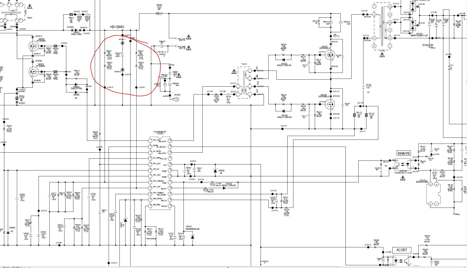 Mislim da to nije mreža sa CXA3809,... ovdje bi trebala biti G2LS koja ima SSC9513, no, megaohmske otpore ka plusu mrežnog elka bi i ovdje bilo dobro provjeriti-prelemiti... jednako tako mrežni elko 120uF/450V, brzu diodu FMN1056S i fet na toj liniji Q301. Izmjeri PFC kod starta.