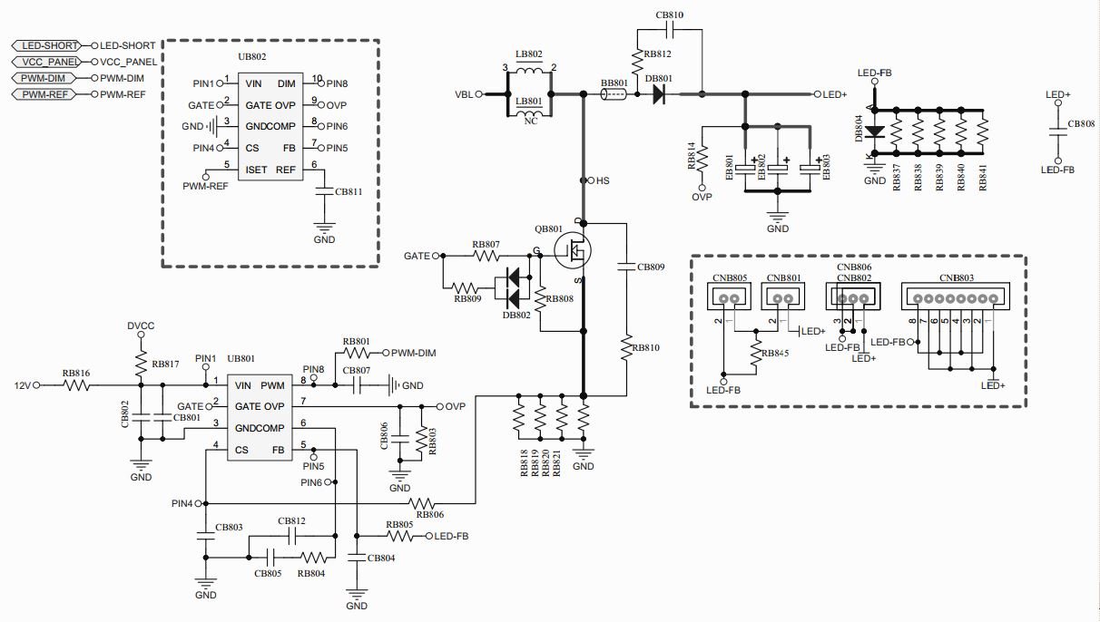 77 v u trenutku ukljucenja (mereno digimerom),padne na ispod 60 . Tv ne ide u Stby rezim, ostane ukljucen. Skinuta sema sa interneta, koliko sam uspeo da procitam (odstampana) sema je TP.S2T512.PB83C. LED drajver kolo na semi je 8-pinsko a na TV-u je 10-to pinsko SN510DP. Ima napajanje na nogici 1, 12v. Nisam primetio da se ista greje. Merena dioda DB804 LED-FB, u kratkom je spoju nisam je otkacinjao ,pretpostavljam da tako pokazuje zbog ovih otpora u paraleli. Verovatno da odradjuje OVP.Na semi na 8-mo pinskom kolu OVP je na nogici 7 a na semi verzija sa 10-to pinskim kolom OVP je na nogici 9. Na semi na nogici 7 su kondenzator i otpor drugim krajevima vezani na masu, na 10-to pinskom na nogici 9 kondenzator i otpor koliko sam mogao da premerim drugim krajevima nisu vezani za masu