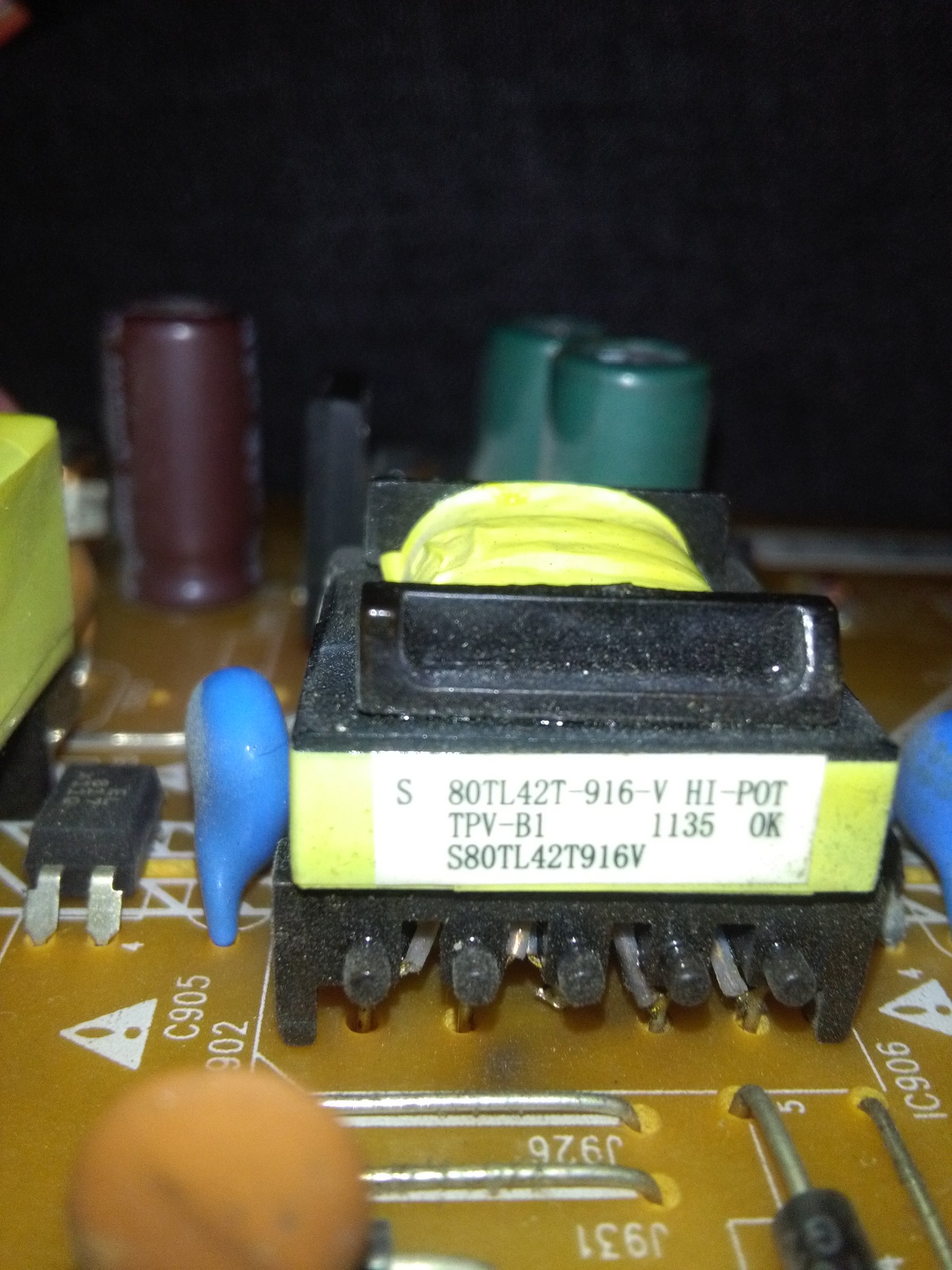715G4801-P1A-H20-002U po šemi na pinu 4 TNY277 trebalo biti oko 300V a on je 0V sumnjam na Transformator T902 koji bi preko namotaj trebao taj napon da prosledi na PIN 4 TNY277 a na transformatoru Jedan pin ima 295 V drugi 0V , ali nisam siguran da je to kvar pa neko stručan da pojasni i pomogne detaljnije.