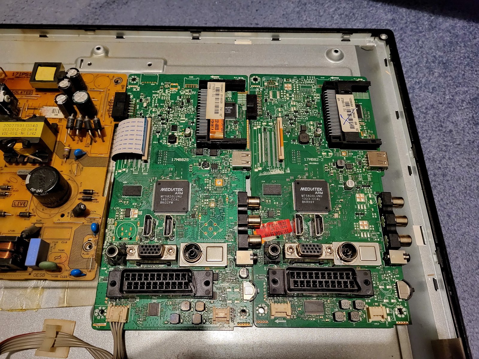 Na TV-u je originalno bila ploča Vestel 17MB82-2. Ne znam šta se desilo s TV-om, ali je definitivno crkao procesor, usija se čim se dovede napon. Igrom slučaja imam kod sebe vrlo sličnu Vestel ploču, 17MB82S. Isti procesor, skoro identičan layout PCB-a, minimalne neke razlike ovako na oko. Ploča je skinuta sa nekog VOX HD Ready televizora.