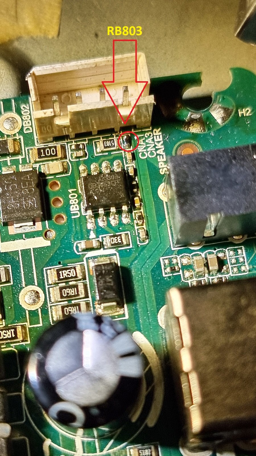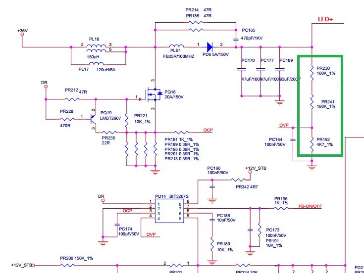 Na pomenutom TV-u je potrebno zameniti ploču. Ja imam potpuno ispravnu i proverenu takvu ploču koja je skinuta sa nekog Bluebbery-a. Ploče se jedino razlikuju u napajanju za LED trake. Na Fox-u su 2 trake sa po 6 LE dioda od 6V, a na Blueberry-u su 2 trake sa po 6 LE dioda od 3V. Kada postavim led trake sa LE diodama od 3V, osvetljenje radi bez problema. Nakon pregleda ploče našao sam samo razliku u delovima na pozicijama QB801 (SM1A23N - Zamenjen sa ME10N15-G), EB802 (100uF/63V - Zamenjen sa 22uF/160V, EB801 (680uF/35V - Zamenjen sa 100uF/63V), DB102 (HBR10150S - Zamenjen sa MURD1040) i TB101 (SYEQ2612-T004 - Zamenjen sa SYEQ2612-T003). Pre zamene pomenutih komponenti, na konektoru CNB822 za napajanje led traka, mereno prema masi, bilo je oko 19V. Nakon zamene sam dobio oko 40V i to bi trebalo da je u redu. Ali problem nastaje kada uključim TV, taj napon na konektoru CNB822 na kratko ode do 60V i vrati se na 40V.