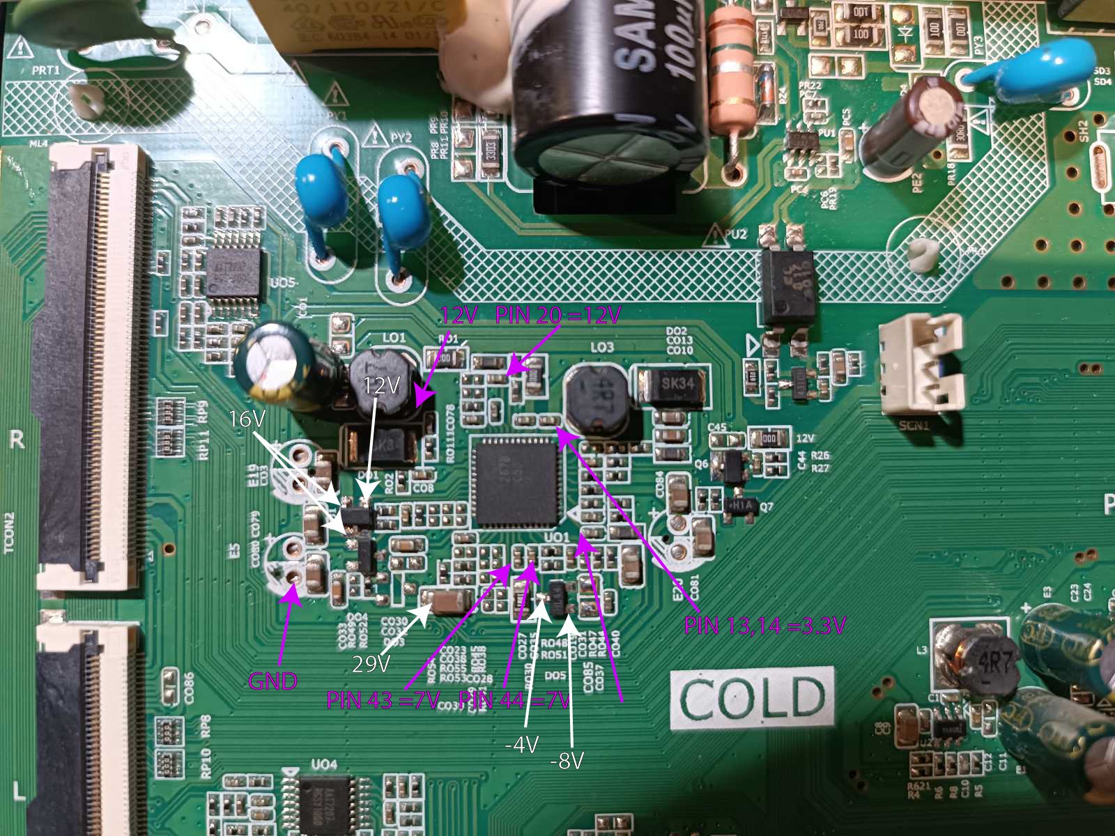 Merenja su izvršena bukvalno na vrhovima strelica, tamo gde pokazuju. Po ovome sve radi, ali mi nije jasno zašto prilikom jednog startanja matične ploče (1 od 5), nisam dobio VCC na 1 i 2 pinu. I tv kolo je bilo mrtvo. Sutra ću probati da vratim ploču u šasiju i vidim šta se tada dešava.
