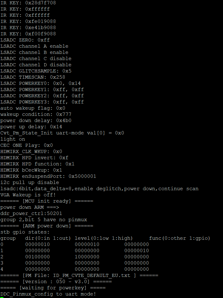Uspeo sam zahvaljujući Alex-i i Ranesu preko pinova na VGA pin 12--Tx na Rx----programatora, i VGA pin 15--Rx na Tx programatora da ostvarim vezu, koristio i puTTy i Tera Term programe, (PuTTY veća slova više mi odgovara). CPU je Hi3751v350. Ubo sam uticnicu u struju, tv je još u Stby počelo je očitavanje podataka, do komande za uključenje tv-a."waiting for power key", i tu je stao. Prema ranije pročitanim uputstvima za druge kolege, trebalo je (valjda) da ja ukucam "mt886#eboot recovery", posle daljinskim (?) WIPE DATA i WIPE CASH. Kako ne znam. Startovao tv na daljinski počelo dalje očitavanje