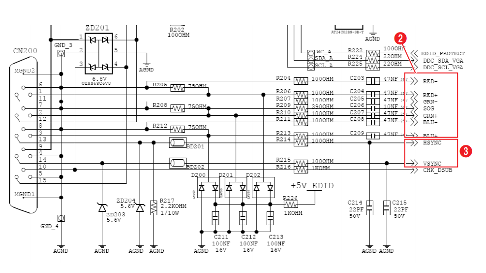 SMD oznake na ove dve komponente su C96RJ i C16YJ, ali nema šanse da pronajem šta je ovo zapravo, da li su zener, TSV diode, ili neka druga vrsta ESD zaštite za ulaz. U svakom slučaju, skidanje zaštite sa ulaza ne bi trebalo da spreči monitor da se prijavi ispravno na kompjuter, zar ne? Pošto ne mogu da nađem šemu, ne mogu ni da ispratim kojim putem idu EDID/DDC signali, pa mi stvarno nije jasno što se sad monitor ne prijavljuje kako treba.