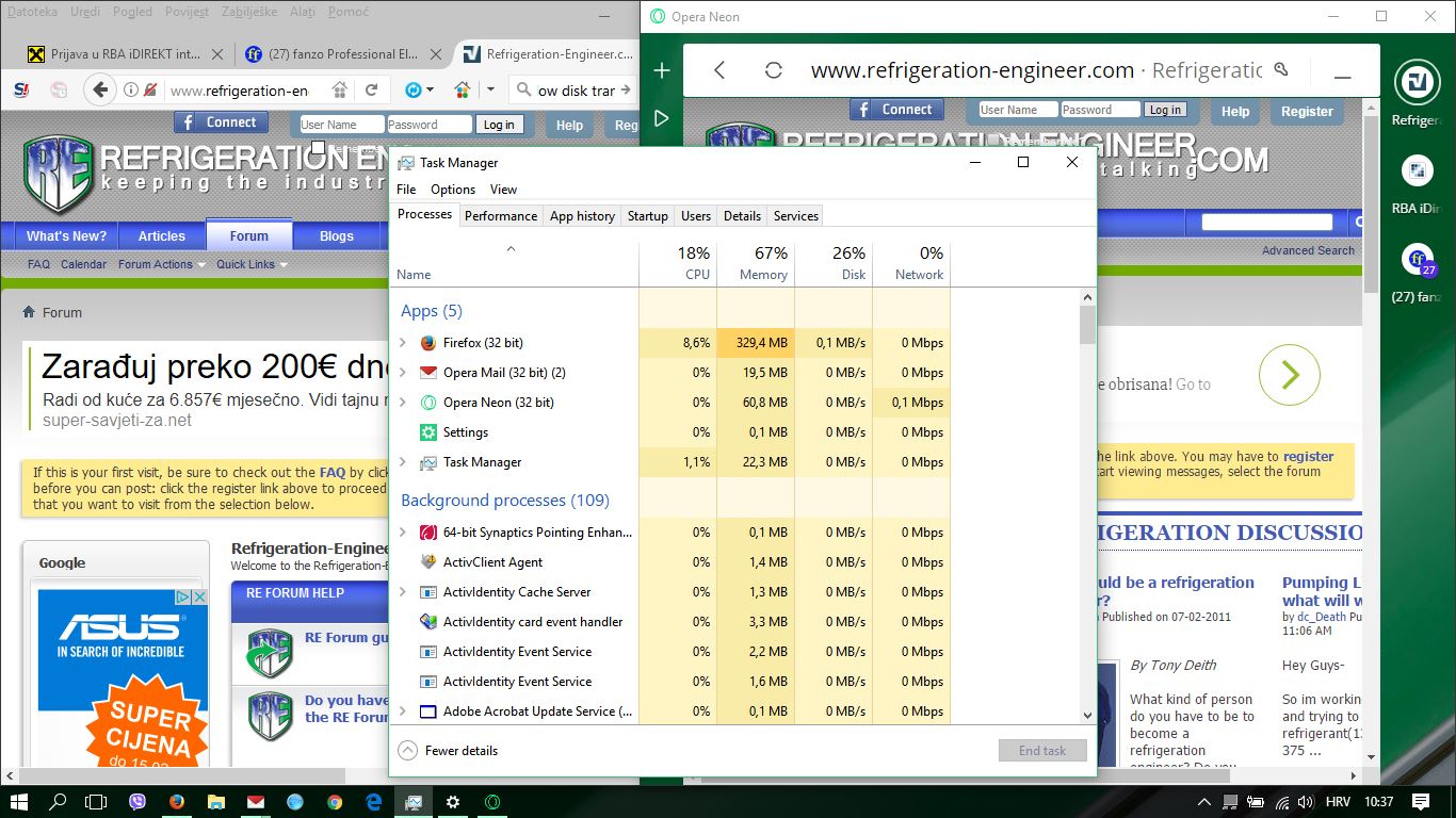 Što se tiće procesorske snage i resursa, otvori Task manager pa ćeš se iznenaditi koliko malo traži! Kao što se vidi iz slike, kod mene to radi mnogo glađe na Operi Neon i ne zauzima ni puno RAM-a niti opterećuje procesor. Oba browsera imaju otvorena 3 taba sa istim stranicama na njima.