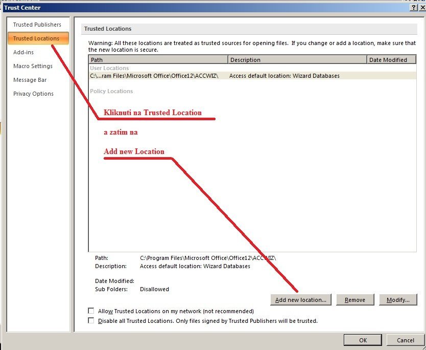 Kao što se vidi na sledećoj slici, treba kliknuti na Trusted Location a zatim na Add new Location