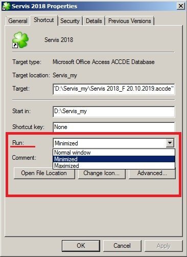 Zatim kliknite desnim tasterom miša na tu prečicu (shortcut) i pod stavkom Run izaberite Minimize kao na slici ispod.