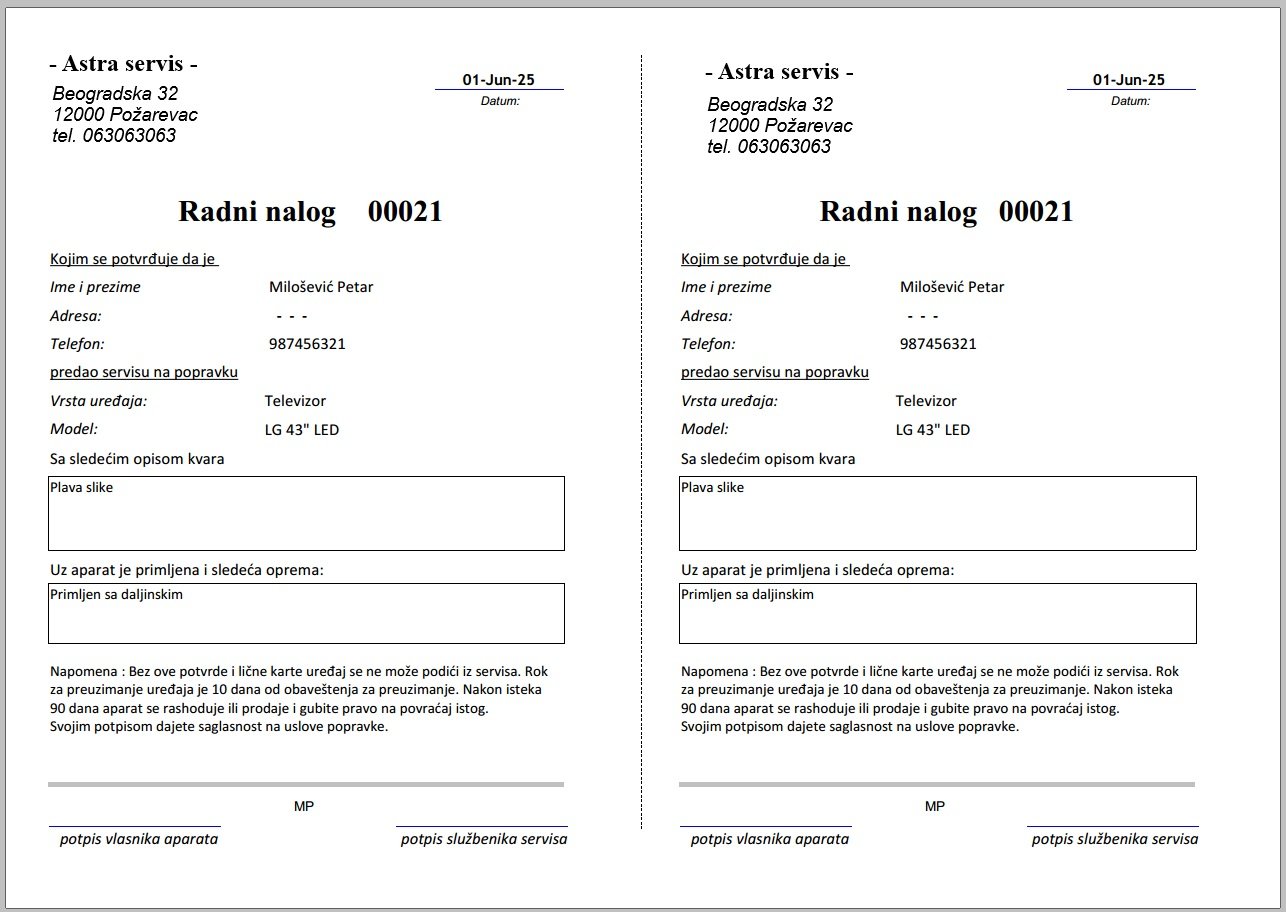 Prilikom prijema aparata na popravku kao i prilikom izdavanja, štampaju se radni nalog ili račun sa svim neophodnim podacima.