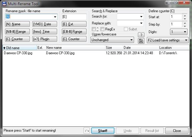 With this dialog box, you can rename a list of files selected in Total Commander. Instead of * and ? wildcards, this function uses placeholders in brackets []. The new names are immediately shown in the result list, but the files are not renamed until the Start! button is pressed.