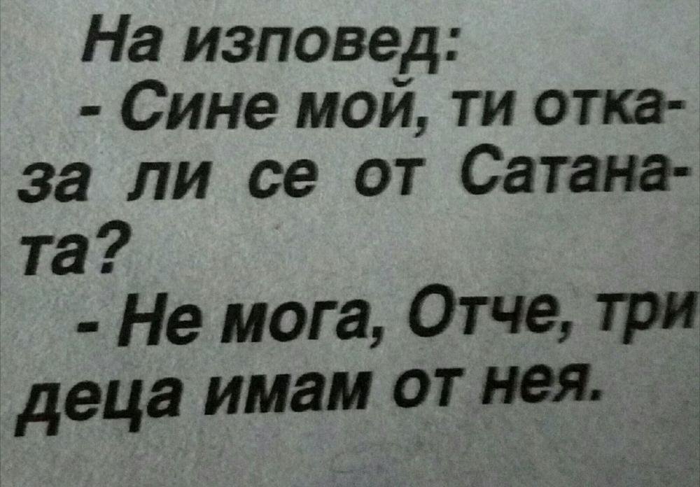 Pre neki dan u antikvarnici sam naišao na staru knjigu sa receptima za izbacivanje đavola. Nabavio sam žabe, životinjske oči, kljunove, kandže, sušeno korenje i još neke druge potrebne stvari. Kod kuće sam ih dobro izmešao, skuvao, tečnost sam nanosio svuda i prskao zidove. Kao posledica mojih postupaka, supruga je napravila veliki skandal, razbesnela se, spakovala kofere i otišla. Te hoću da kažem, ovi stari recepti zaista djeluju ...