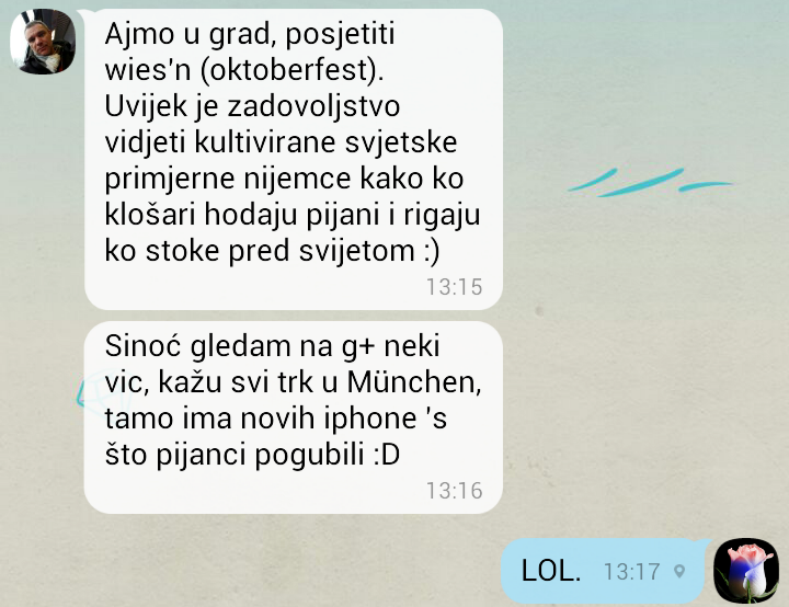 Inače, trava je uvek zelenija kod komšije, to je opšte poznata stvar. Samo što nije stvar u komšijinoj travi, već u našem pogledu na tu travu... Nikad nisam bio u Nemačkoj, pa ni u Minhenu. Ali planiram u nekoj bližoj budućnosti. Ne zbog gore pomenutih, nego zbog turizma i prijatelja kojeg nisam video decenijama...