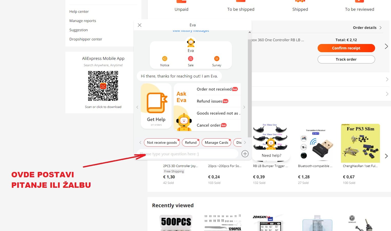 Ja sam ovde postavio pitanje i žalbu na prodavca kao na slici. Eva jeste robot ali pitanje se šalje živom Kinezu koji posle šalje odgovor. Meni su tako vratili novac a imao sam identičnu situaciju kao @goranfri.