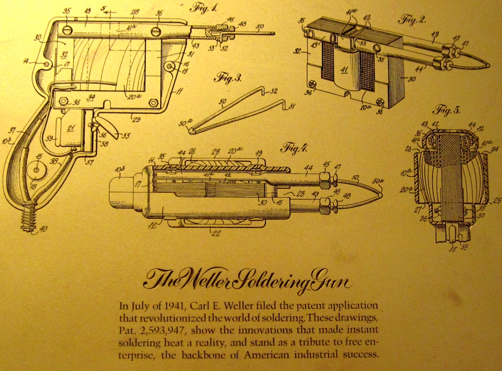 Prva pištolj lemilica koju je Carl Weller napravio ručno, odnosno prvih 275 komada koje je prodavao. Kućište je bilo drveno. Godine pre 1941. Patent je prijavio 1941. Odobren 1946. Otvorio je fabriku i prva Speed Iron serija krenula u prodaju aprila 1946. Zatim je bilo još nekoliko revizija ovih pištolj lemilica... da bi 1958 prijavio patent za Magnastat. Patent odobren 6.sept.1960. Zatim još nekoliko revizija pištoj lemilica .. da bi 1967 izašla prva magnastat baza W-TCP Zatim uveliko popularne pištolje lemilice .... revizije...