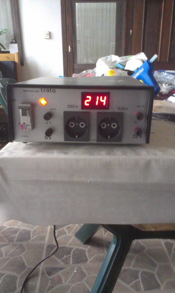 U zadnje vreme nam se dešava da izbacuje fid sklopka kod testiranja neispitanih racunarskih napajanja a i u cilju zaštite osciloskopa kod merenja, pa da se to više ne dešava moralo se ili naručiti odvojni trafo (od jednog kilovata torusni košta 95 evra) ili iskoristiti neke trafoe iz pokvarenih uređaja da bi se imao odnos 1 na 1..U tu svrhu sam iskoristio dva trafoa od Mustek UPS koji se mogu opteretiti sa 450W što je sasvim dovoljno.Stvar je u tome da se spoje 12V izlazi (sekundari oba trafoa), na jedan trafo se dovede 220V a sa drugog trafoa se koristi 220V za napajanje uredjaja koji su predmet rada.Utičnica nema uzemljenje i to joj je svrha.Znači, trebaju vam dva trafoa sa istim naponima sekundara od barem 200W.Za merenje izlaznog napona zadužen je AC voltmetar.Na prednjoj ploči preko banana obezbedjeni su još naizmenični naponi od 6V i 32V .Uređaj se uključuje preko automatskog osigurača od 6A (Eti), za sekundar je zadužen bimetlni osigurač od 5A.