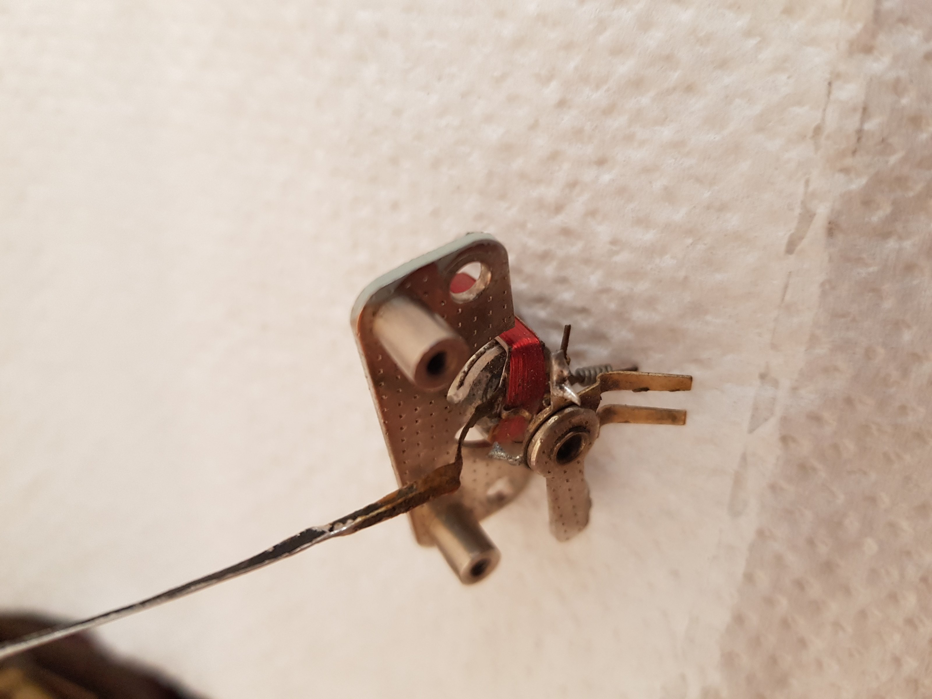 Crna zica je odlemljena, sa obrirom na poziciju ostavlja se nekoliko mesta gde treba da bude. Ovde mi je potreban savet, da li ide na ovu zutu na trafo? Problem br. 3. Najveci problem je skretni kalem, ocistio sam ga od prljavstine. Magnet takodje. Nisam slikao dobro ali mi deluje da je spirala otkinuta. Taj deo konstrukcije mi nije jasan kako treba da izgleda. Šraf koji pomera kazaljku, da li je taj deo povezan sa spiralom... ???