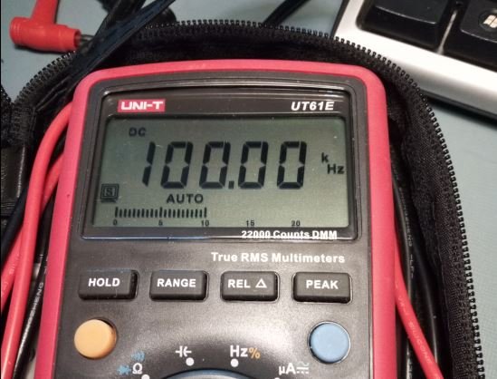 U uputstvu o instrumentu se navodi da isti radi na 100kHz i da je talasni oblik napona sinusni. Kako sam probe radio kod kuće, nijesam imao pri ruci osciloskop da provjerim talasni oblik ali jesam provjerio frekvenciju. Kao što se vidi na slici, oscilator mu radi tačno na 100kHZ.