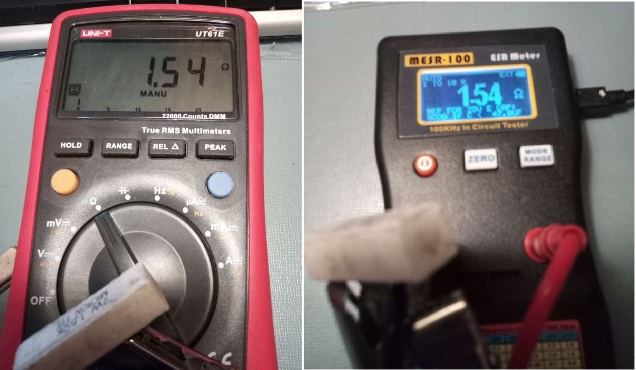 Prije bilo kakvog mjerenja i upoređivanja, izmjerio sam omsku otpornost mjernih kablova (pipalica) kod oba instrumenta. Takođe, mogu upoređivati čistu omsku otpornost kod oba instrumenta. Ono šta nijesam mogao da uporedim je izmjerena vrijednost ESR. Kako nemam profesionalni ESR metar, upoređivati MESR-100 sa „makedoncem“ bi bilo neozbiljno.