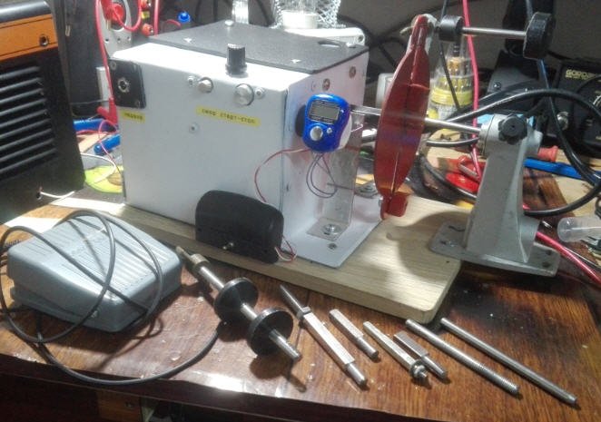Za brojanje sam na aliekspresu naručio mali digitalni brojač kome sam na taster za okidanje paralelno zalemio dvežice koje sam zalemio na stakleni Rid prekidač koji je zalemljen na pertinaks pločicu.Ploćica je pričvršćena na limeni nosač koji se može pomerati za podešavanje udaljenosti Rid relea od magneta koji je zalepljen za osovinu motora.Magnet sam iskoristio od starog hard diska te sam ga brusilicom skratio na potrebnu meru.Danas sam odradio priključak za nožni prekidač (prekida napajanje od 12v na signal generator) kao i kuciste za 1,5V bateriju (sa prekidačem) za napajanje brojača (anulirana njegova interna baterija).
