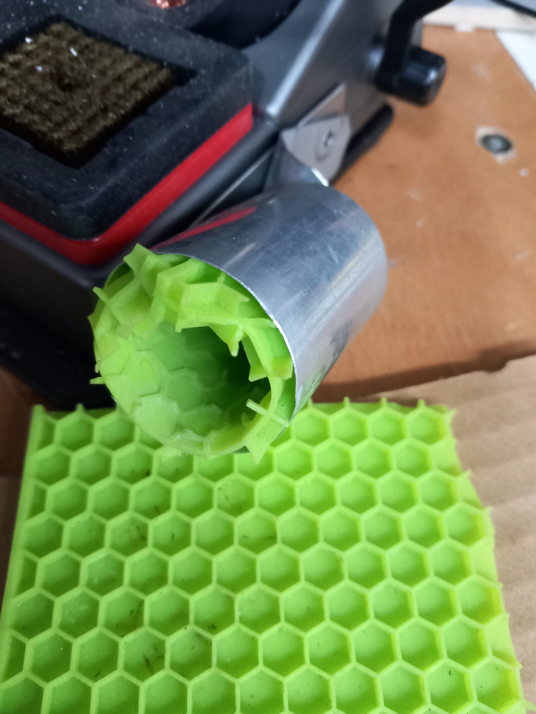 Dodatak aspiratoru, mada i bez toga lepo radi.U pitanju je levak ili hauba i u tu svrhu je iskorišćena plastična posuda kojoj je isečeno dno i malo više od njega da se može napasovati i toplim lepilom zalepljeno na ventilator.