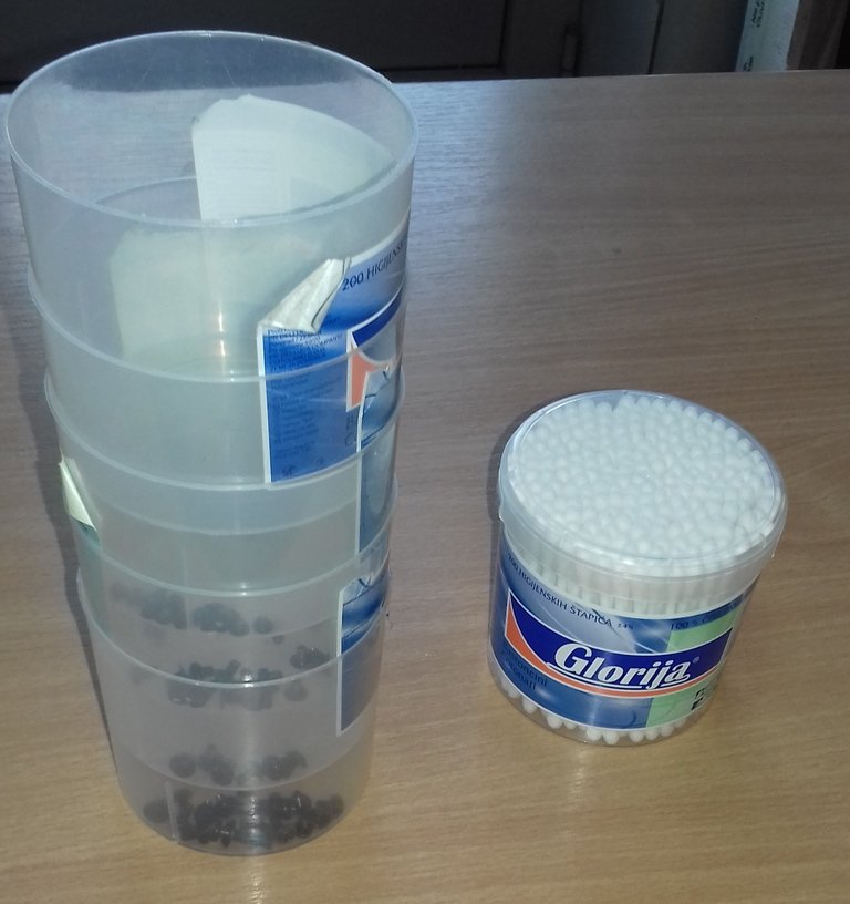 Prilikom rasklapanja TV-a šrafiće selektujemo,po fazama rasklapanja u odvojene posude.Ali desi se ponekad da posuda ispadne.Rešenje su potrošene mekane plastične kutije od štapića.Idu jedna u drugu i ostaje oko 3cm prostora.Dovoljno za razne šrafiće i manje plastike.Dobijeni toranj zauzima malo mesta,može da ispadne,da se skloni sa stola bez gubitka redosleda sklapanja.I takođe bitno,nema viška srafića ili plastika kad se sklopi TV jer je prvi nivo pri sklapanju gornji,pa svaki sledeći nivo prati fazu sklapanja.