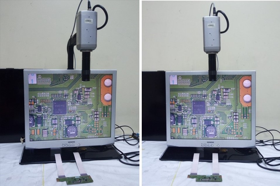Na slici ispod se vidi stolarski metar ispod kamere. Na monitoru je 1 cm realni prikazan kao 20 cm (ovo je slika sa drugim objektivom). Ovdje nema digitalnih zoomova. Monitor prikazuje ono što dobije.