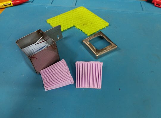 Nastavak za silikonski čistač vrhova.Ovo je konačno rešenje silikonskog čistača vrhova a sastoji se iz četvrtaste posude sa otvorenim poklopcem dimenzija 40x40x40mm rađena od 1mm nerđajuđeg lima, silikonska podloga bilo koja (može i 2 ravne kuhinjske silikonske varjače ) i 4 silikonske četke.Prvi i zadnji sloj (sa malim prorezom) je podloga dok su četke 2 po 2 unakrsno stavljene s tim da je višak kompaktnog dela četke odsečen skoro do kraja a da su čekinje i dalje povezane.