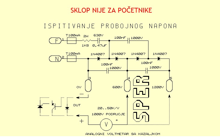 Probojni napon tranzistora i dioda, pa i kondenzatora se može meriti tako što se priključe na strujno ograničeni izvor (do 100uA). Za tu namenu sam pravio poseban instrument, koji je u sklopu tranzistor testera. To je deo u crvenom okviru, pa i to može da se pojednostavi, ako se izbaci opseg do 200V a ostavi samo onaj do 2KV.