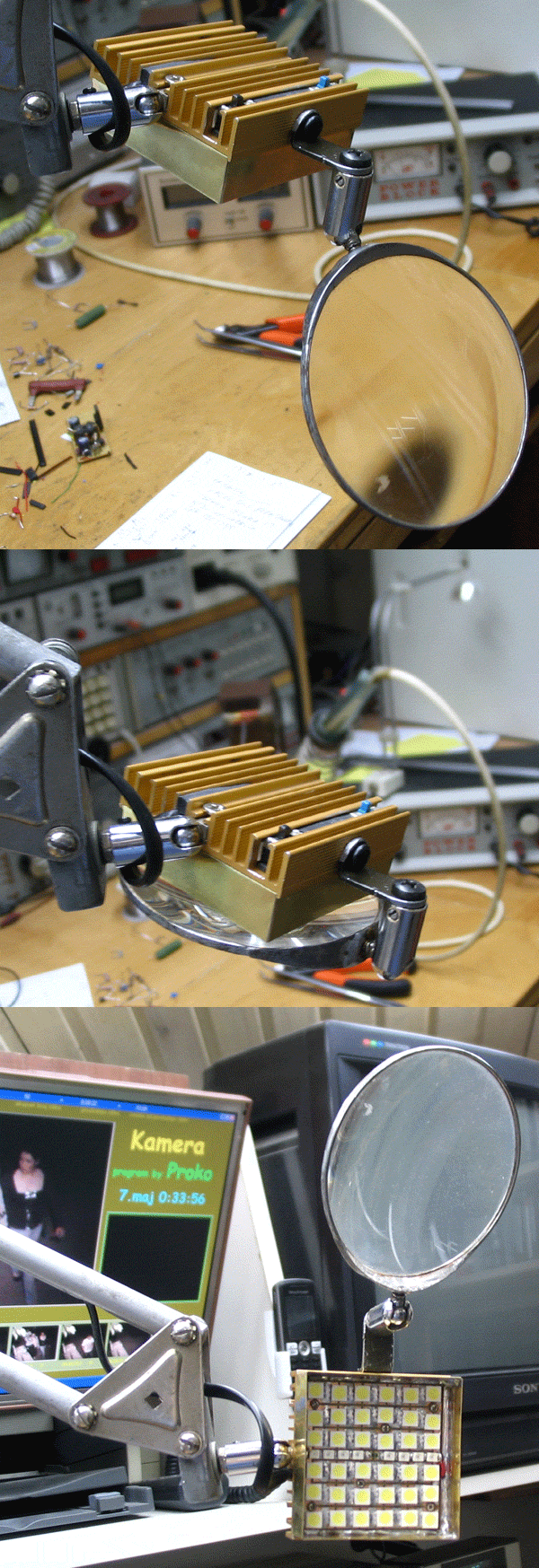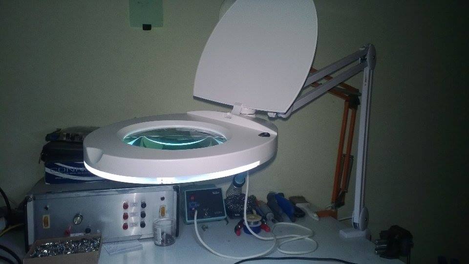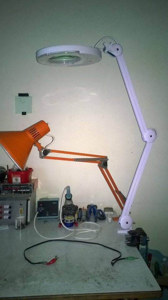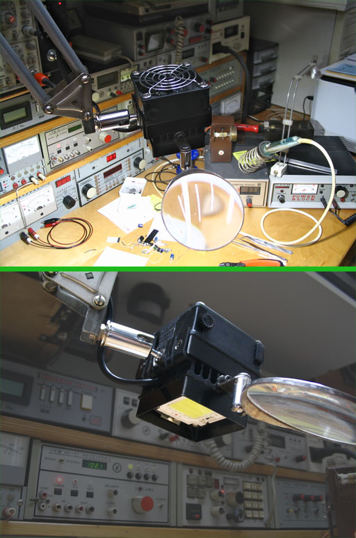 LED svetiljka koju i sada koristim je idealna u svakom pogledu; mala je i zbog toga ne smeta u prostoru, ne greje se puno (mada LED mora da se hladi, ali sve to sam uradio prilično kompaktno), svetlosti je dovoljno, ima čak i rezerve (stavio sam regulator 10-30W). Što se tiče lupe, na slici se vidi improvizovana lupa napravljena od optičarskog stakla 10 dioptrija. Lupa je sastavni deo svetiljke, i može da se preklopi ispred same svetiljke.