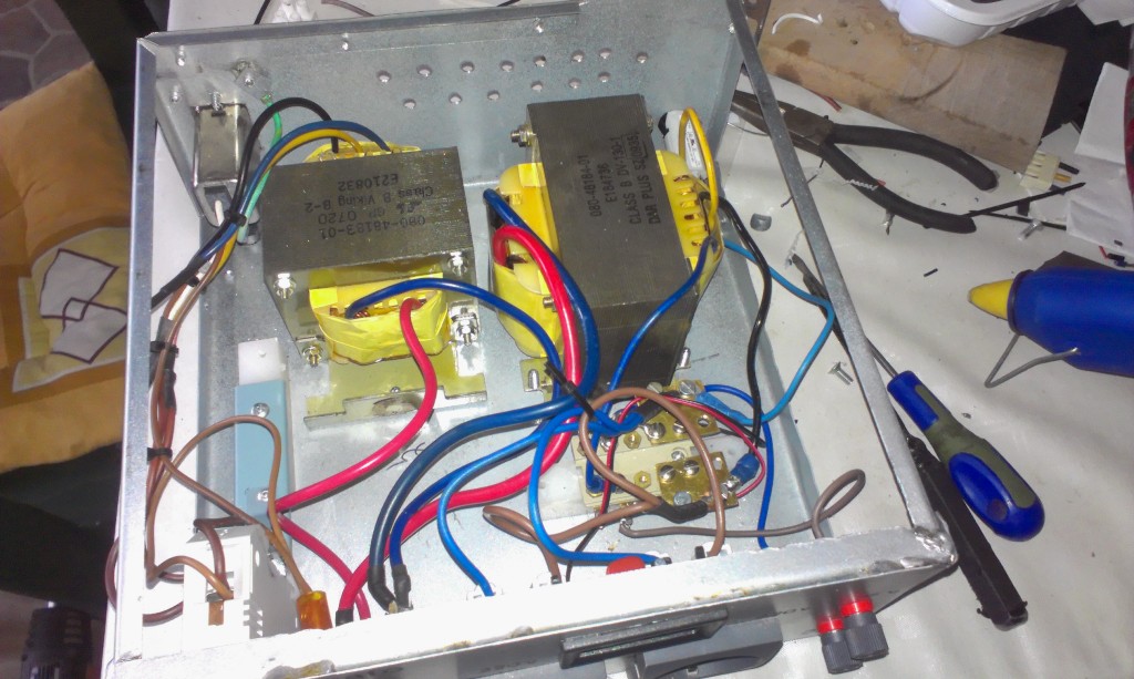 U zadnje vreme nam se dešava da izbacuje fid sklopka kod testiranja neispitanih racunarskih napajanja a i u cilju zaštite osciloskopa kod merenja, pa da se to više ne dešava moralo se ili naručiti odvojni trafo (od jednog kilovata torusni košta 95 evra) ili iskoristiti neke trafoe iz pokvarenih uređaja da bi se imao odnos 1 na 1..U tu svrhu sam iskoristio dva trafoa od Mustek UPS koji se mogu opteretiti sa 450W što je sasvim dovoljno.Stvar je u tome da se spoje 12V izlazi (sekundari oba trafoa), na jedan trafo se dovede 220V a sa drugog trafoa se koristi 220V za napajanje uredjaja koji su predmet rada.Utičnica nema uzemljenje i to joj je svrha.Znači, trebaju vam dva trafoa sa istim naponima sekundara od barem 200W.Za merenje izlaznog napona zadužen je AC voltmetar.Na prednjoj ploči preko banana obezbedjeni su još naizmenični naponi od 6V i 32V .Uređaj se uključuje preko automatskog osigurača od 6A (Eti), za sekundar je zadužen bimetlni osigurač od 5A.