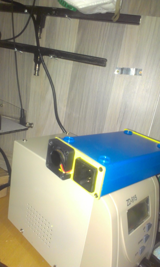 Da bi poboljšao hladjenje elektronike u dnu prednjeg dela sam sa jedne i druge strane izbušio par rupa a na zadnjem delu kućišta sam postavio ventilator od 5V koji se napaja preko regulatora od 5V iz 24V napajanja.Minus pol napajanja je vezan na uzemljenje.Kućište i maska su ofarbane u hakko boje da je u skladu sa ručkom.Ugrađen sa desne strane prekidač za paljenje.