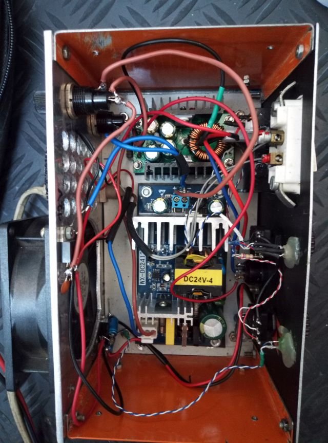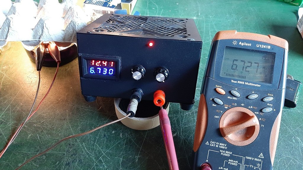 Druga varijanta je da prikačim modul na neki stabilisani izvor napona 24V. Slučajno sam imao takav u radionici. Naručio sam ga svojevremeno za lemilicu i ostao mi je višak. Ovaj mrežni modul daje na svom izlazu stabilan napon 24V i max struju 5A