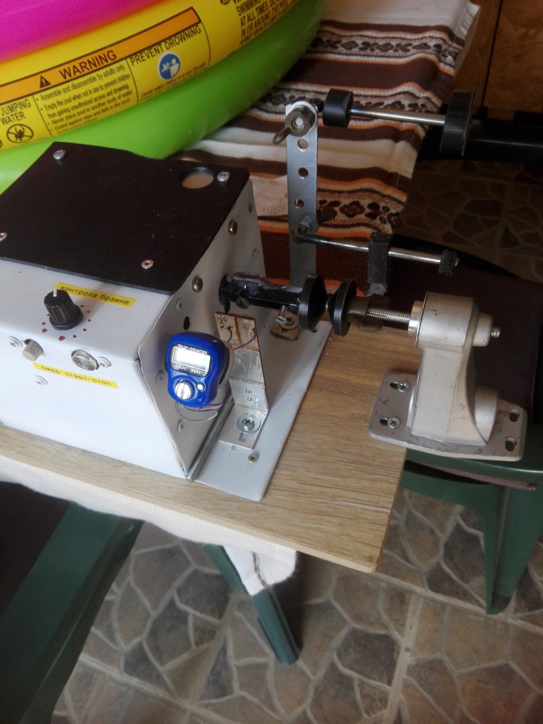 Za brojanje sam na aliekspresu naručio mali digitalni brojač kome sam na taster za okidanje paralelno zalemio dvežice koje sam zalemio na stakleni Rid prekidač koji je zalemljen na pertinaks pločicu.Ploćica je pričvršćena na limeni nosač koji se može pomerati za podešavanje udaljenosti Rid relea od magneta koji je zalepljen za osovinu motora.Magnet sam iskoristio od starog hard diska te sam ga brusilicom skratio na potrebnu meru.Danas sam odradio priključak za nožni prekidač (prekida napajanje od 12v na signal generator) kao i kuciste za 1,5V bateriju (sa prekidačem) za napajanje brojača (anulirana njegova interna baterija).