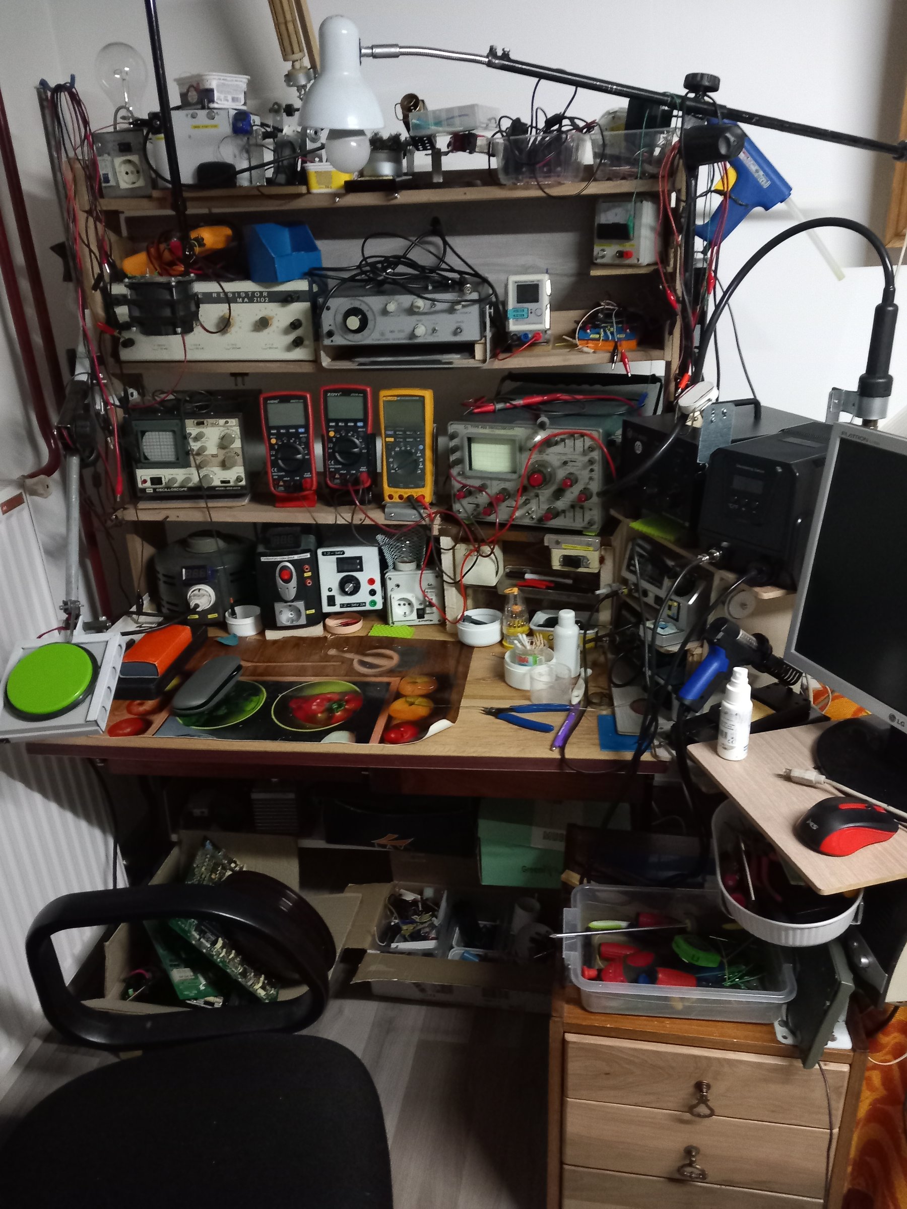 Ovim postom mi je namera da prikažem mladjim kolegama koji kreću da se bave elektronikom, a prostor im je skučen, da se i na malom prostoru može komotno baviti hobijem a u nekim segmentima i profesionalnim poslovima (za početak).Sin i ja u podrumskom delu kuće imamo izdvojen prostor od 15 kvadrata u kojem je smeštena hobistička radionica (hobi ga je opredelio da završi elektrotehniku), nismo vezani profesionalno.Imamo dva radna stola, za većim radi sin, a manji sto je namenjen meni koji sam nakon dužeg vremena ove zime doterao do dobre funkcionalnosti.Kako nam nije primarno zanimanje tako se nismo rukovodili time da oprema ne mora biti nužno skupa ali ni baš jeftina (iako imamo i tkvog alata) i time smo dobili da možemo servisirati skoro svu dostupnu elektroniku.Profesionalno bavljenje traži kvalitetniju opremu ali to ima i svoju cenu koja je ipak isplativa jer se posao može brzo i kvalitetno obaviti.Što se mene i sina tiče nama vreme nije bitan faktor.