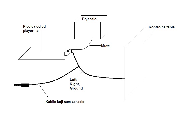Naslikacu za vikend pa cu da okacim. Probacu sada da objasnim, od cd player-a do kontrolne ploce ima kabal koji u stvari salje signal tj. left, right i ground, na njega sam zakacio kabal (Preko kog pustam muziku sa mp3...) Takodje ovaj kabal iz linije je na 4 pinskom cincu na kome jos ima i mute koji ide ako se ne varam do pojacala.