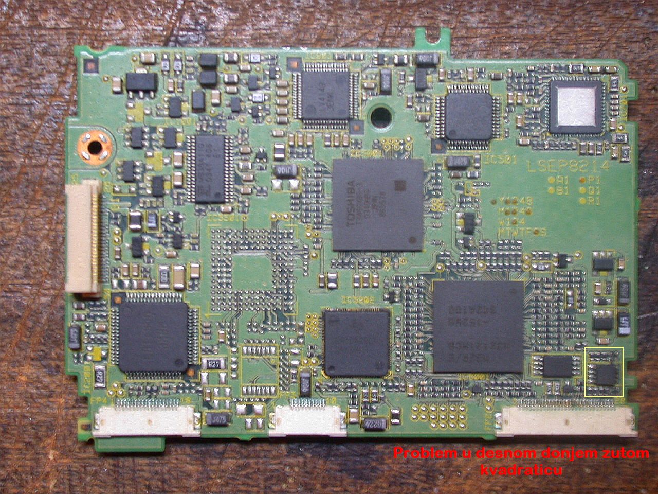 Upala mu je u morsku vodu.Kamera je kod mene dosla poslije par mjeseci i kad sam je otvorio vidio sam da je na OSNOVNOJ ploci otislo nekoliko elemenata ciji su kontakti zardjali od slane vode.2-3 elementa su otpala koji su izgledali kao otpornici ili blokovi i na jednom malom IC kolu su zardjale nogice i oni su otpali.Najvjerovatnije od ploce nema nista ali me zanima da ko nema semu za njega.Ja sam nesto slicno nasao samo nemam podudarne el.seme.Oznake na ploci su :