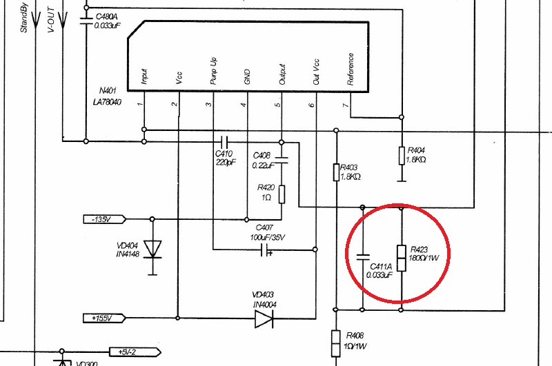 Isto je i kada je AV ukljucen ima 2 AV ulaza i isto se svuda ponasa, da sema vertikale je slicna, R423 180R 1W koliko sam primetio grejao se merio sam ga i ok je nisam imao rezervni pri ruci da probam da zamenim, evo dela seme od tv-a