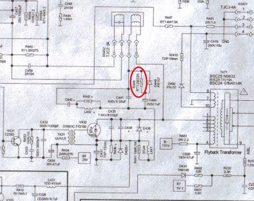 Televizor radi ali se pregreva otpornik na poziciji R446 kod VN trafoa.Potrebna mi je sema za ovaj TV jer ne znam otpornost tog otpornika u horizontali na poziciji R446. Od grejanja su se prstenovi u boji oljuštili.