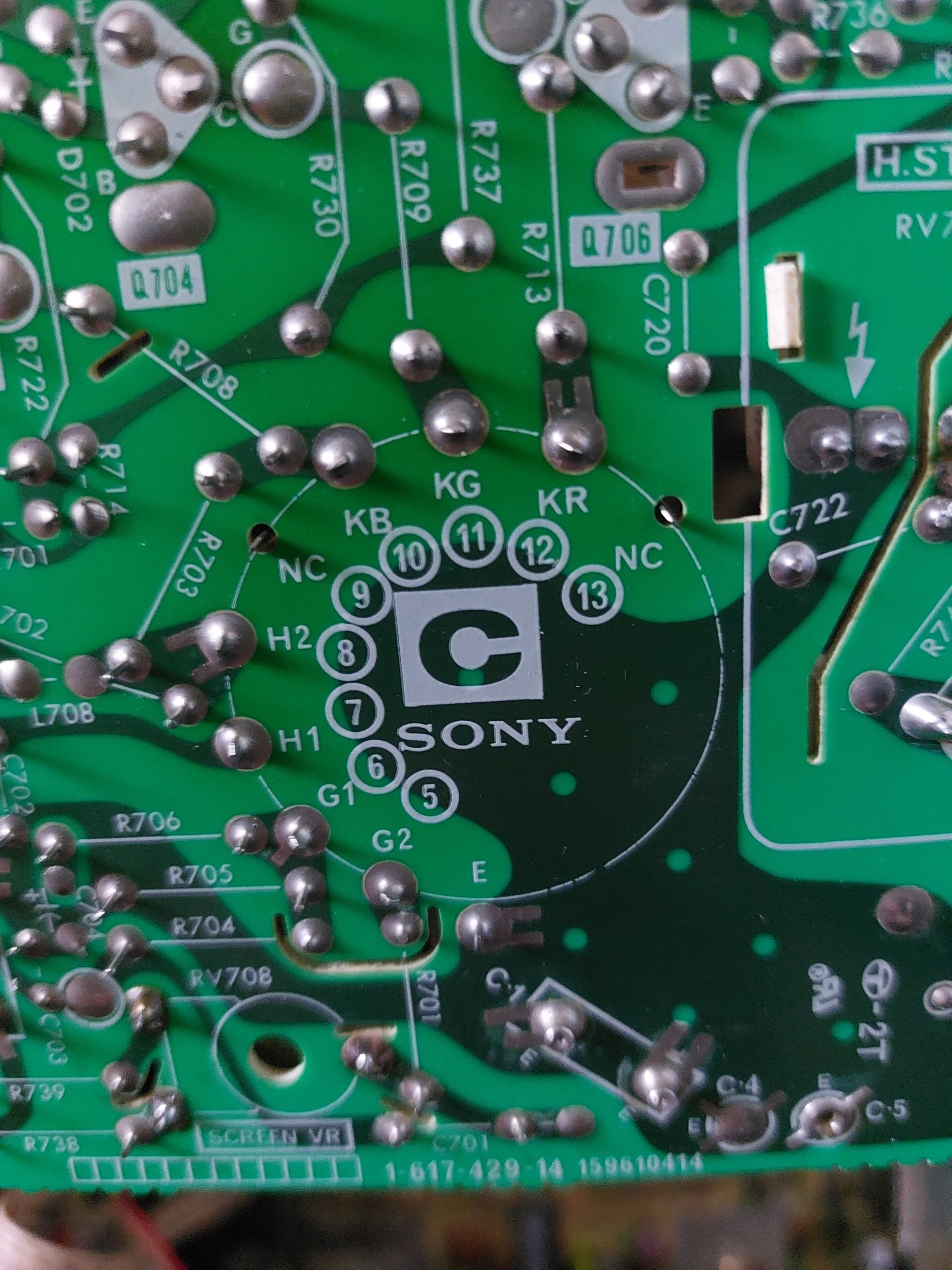 Ja sam uvek tako proveravao ekran da sam otkačio R,G,B katode od napona (Kod tebe otkači R708,R709,R713) i sa jednom žicom na tren kratkospoji sa GND-om katode R,G,B , ako je od ovih jedna boja nikakva znači crko ekran.