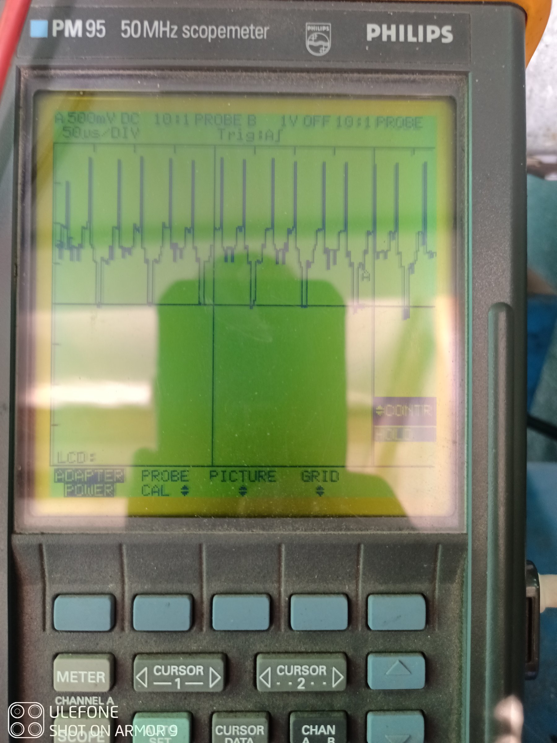Na slici je klasičan video signal. Uvedi ovaj "žuti" signal na scart ili AV u TV i mora da bude slike. Na video signalu se ne vide vertikalni sinhro impulsi ali o tom potom. Možda ih i ima ali se sad ne vide. Uglavnom mora biti slike