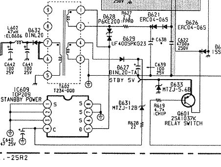 e pa moja iskustva u vezi popravke ovog tv-a očigledno nisu baš najsjajnija.dakle da ponovim - crkao je osigurač,STRF6654 i dioda D629.zahvaljujući stolletu stavio sam diodu uf4005 i preventivno promenio ic TOP209,nikad se ne zna.mada šanse da je crkao TOP209 su male jer D629 nije bila u kratkom spoju već u prekidu.upalio sam tv i ništa.nema ni standby lampicu niti crkava osigurač.nema ni napona na mrežnom elku jer ne uključuje relej RY601.da bi taj relej uključio treba mu,između ostalog,5v na emiter od Q601,a tih 5v opet dobija IC608 a taj napon za rad Q608 dobija od D632.na D632 napon se kreće u rasponu od 0.66v do 1.3v znači nedovoljno za normalan rad.prvo što sam uradio je da izvadim IC608 da bih video da li se napon menja bez opterećenja.na ovaj način sam takođe isključio i IC607.napon na D632 je ostao potpuno isti.sad da ne bih dužio šta sam radio korak po korak navešću samo šta sam menjao.dakle menjao sam D632 - bez promene,potom sam menjao C641 i C642 - bez promene.potom sam menjao D627 i D631 kao i C639 - bez promene.jedinu nepravilnost koju sam primetio je da kada palim tv na D627 imam 7 do 8v i u roku od 15-20sek. napon se popne do 12v.takođe da napomenem napon na 5 nožici ic TOP209 je 300v dok je napon na 4 nožici 5-5.3v.e sad ako neko ima neku ideju šta dalje to bi bilo odlično.